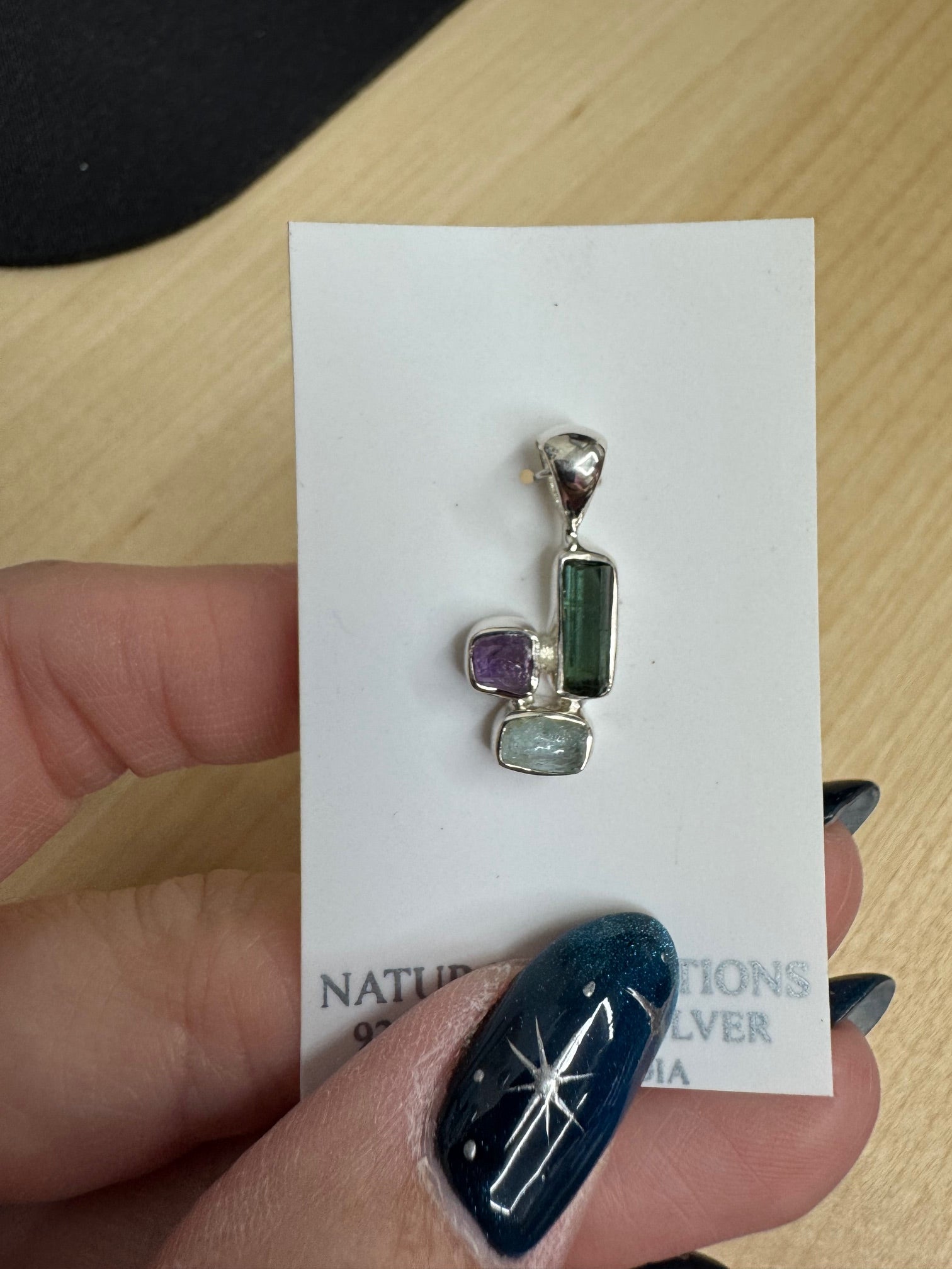 green tourmaline, aqua & amethyst pendant 50