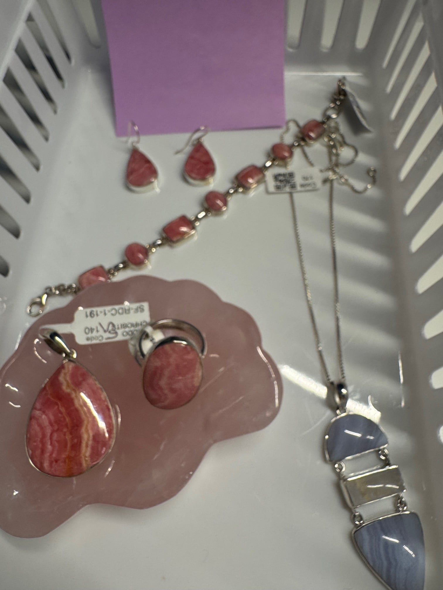 live claims 1/11/25: rhodo earrings 45, rhodo bracelet 95, rhodo pendant 65, rhodo ring 76, blue lace agate & moonstone necklace 78, rose quartz shell dish 28= 387