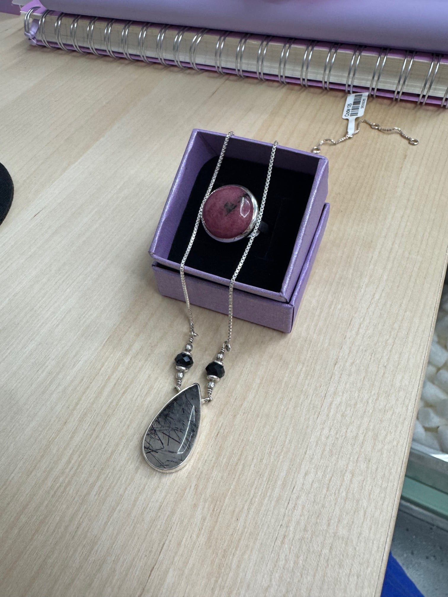 live claims 3/8/25: rhodonite ring 32 rutile necklaces 58= 90