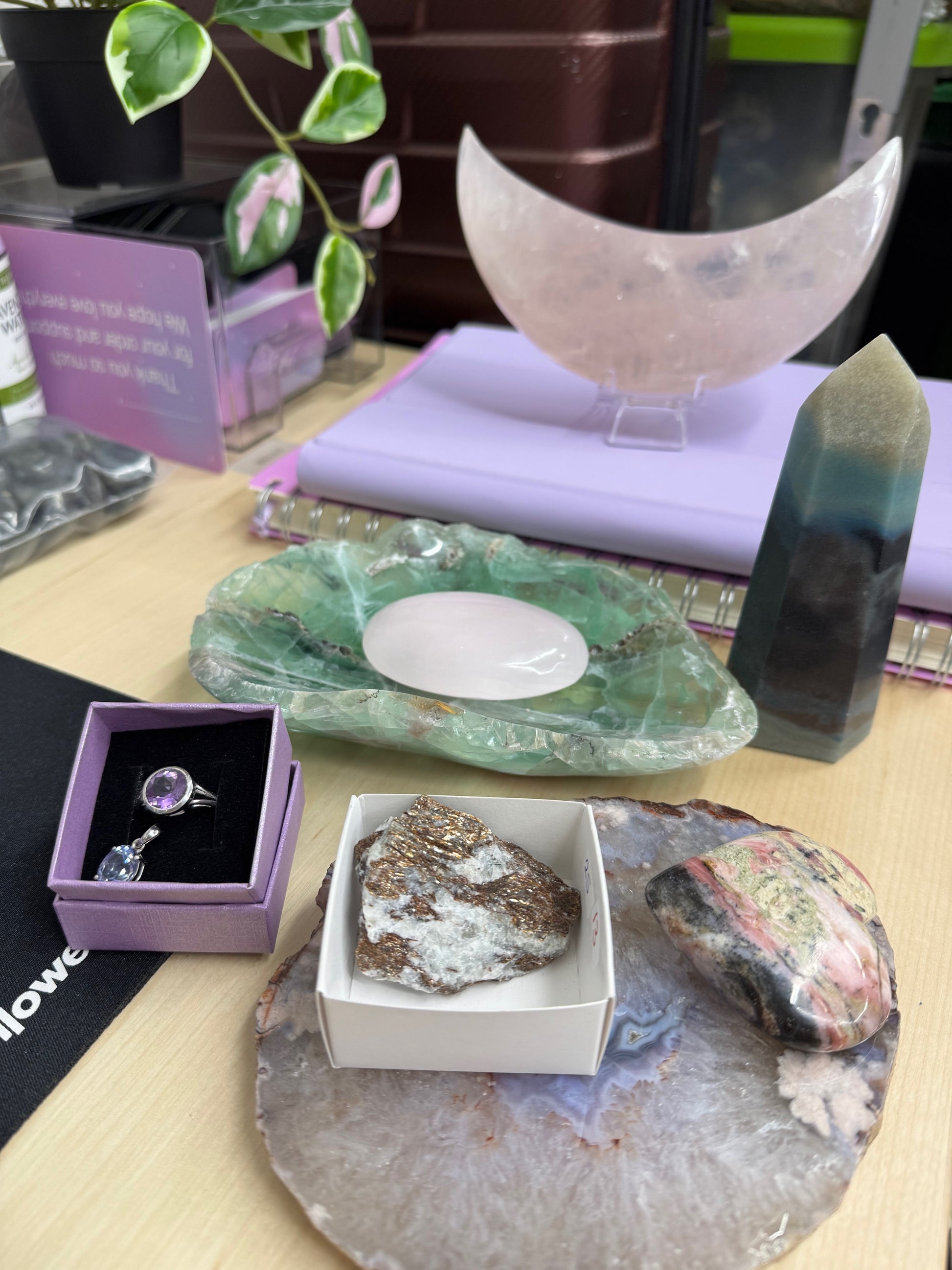 live claims 3/8/25: rose quartz moon 34, fluorite bowl 91, trollite tower 21, blue flower agate slab 21, mangano calcite palm 14, strawberry opal heart 10, astrophyllite 13, amethyst ring 48, mystic quartz pendant 60= 312