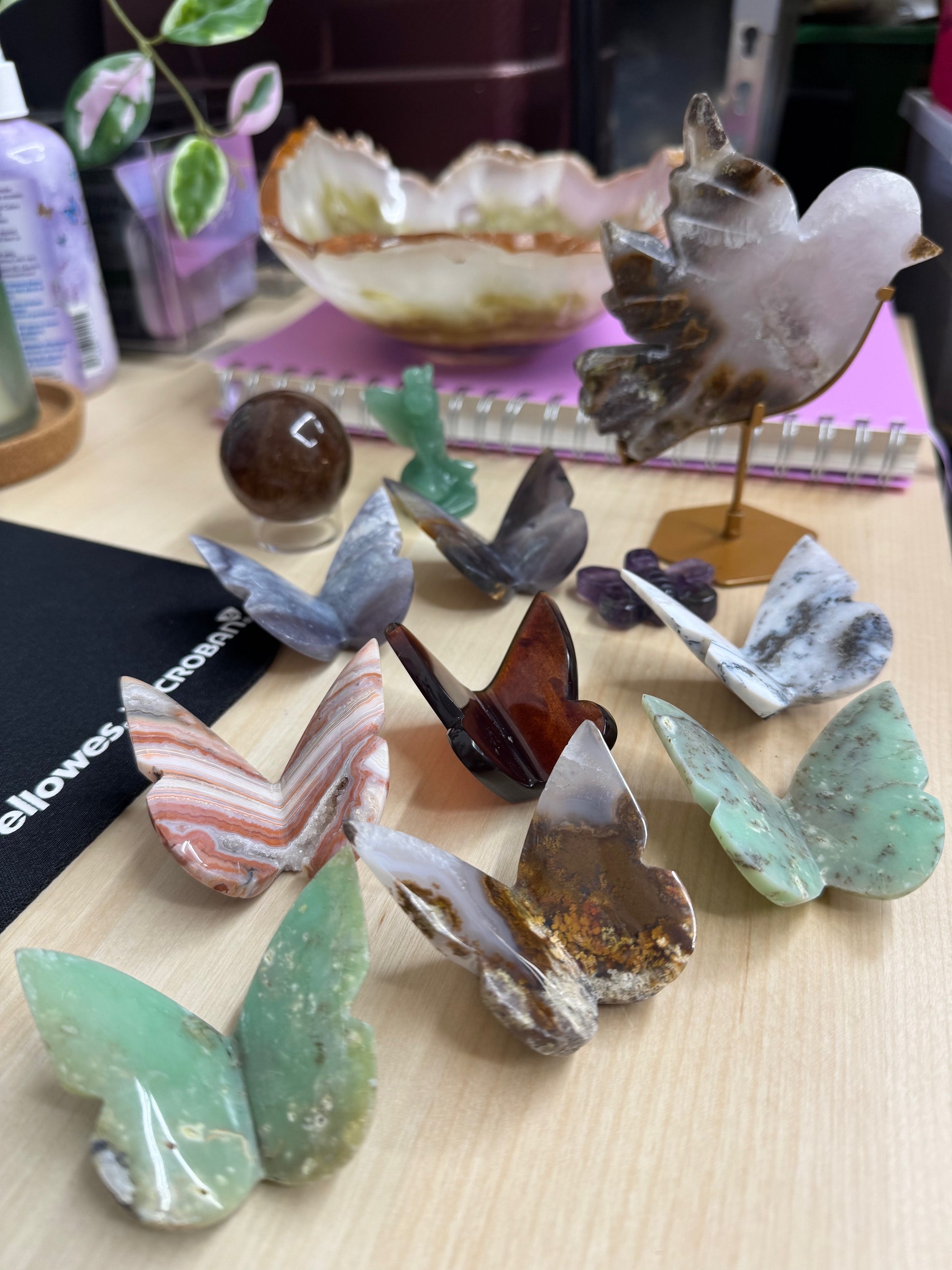 live claims 3/1/25: green onyx bowl 115, scenic moss bird 65, rutile sphere 65, blue amber butterfly 20, 2 purple chalcedony 44, 2 chrysoprase 44, pink crazy lace 22, dendritic agate 22, scenic moss 38, tinkerbell 12, fluorite bee 15= 462