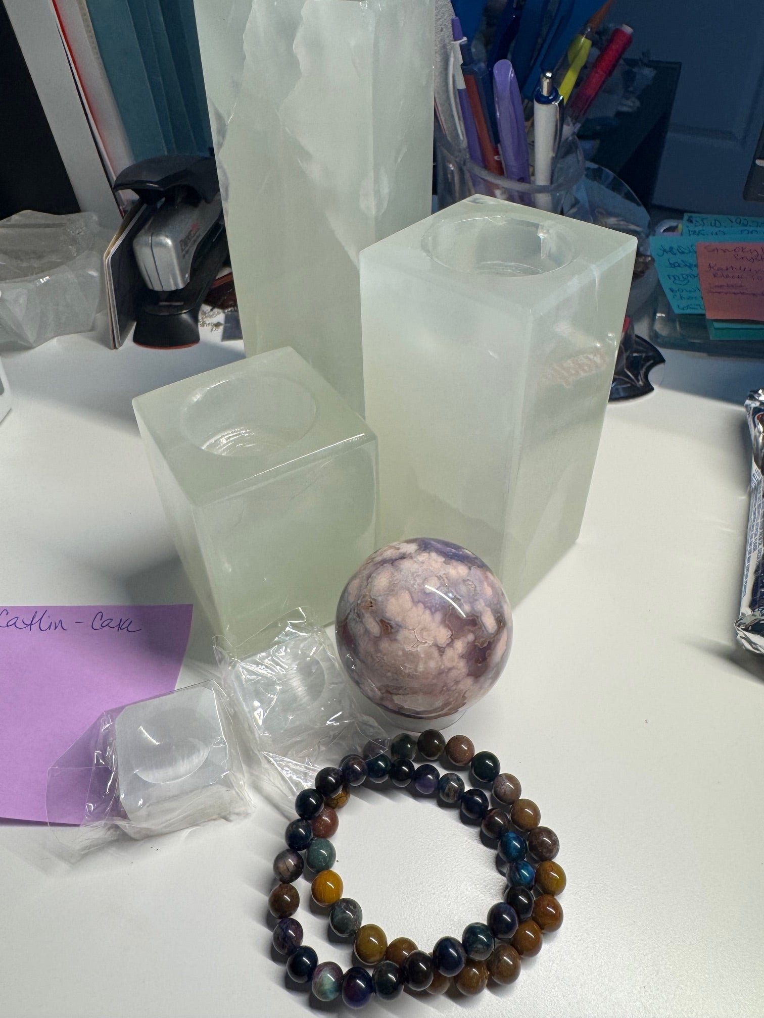 live claims 1/11/25: onyx candle holder set 70, blue flower agate sphere 42, 2 selenite sphere holders (2x4) 8, oj 8 & galaxy tiger's 8= 136