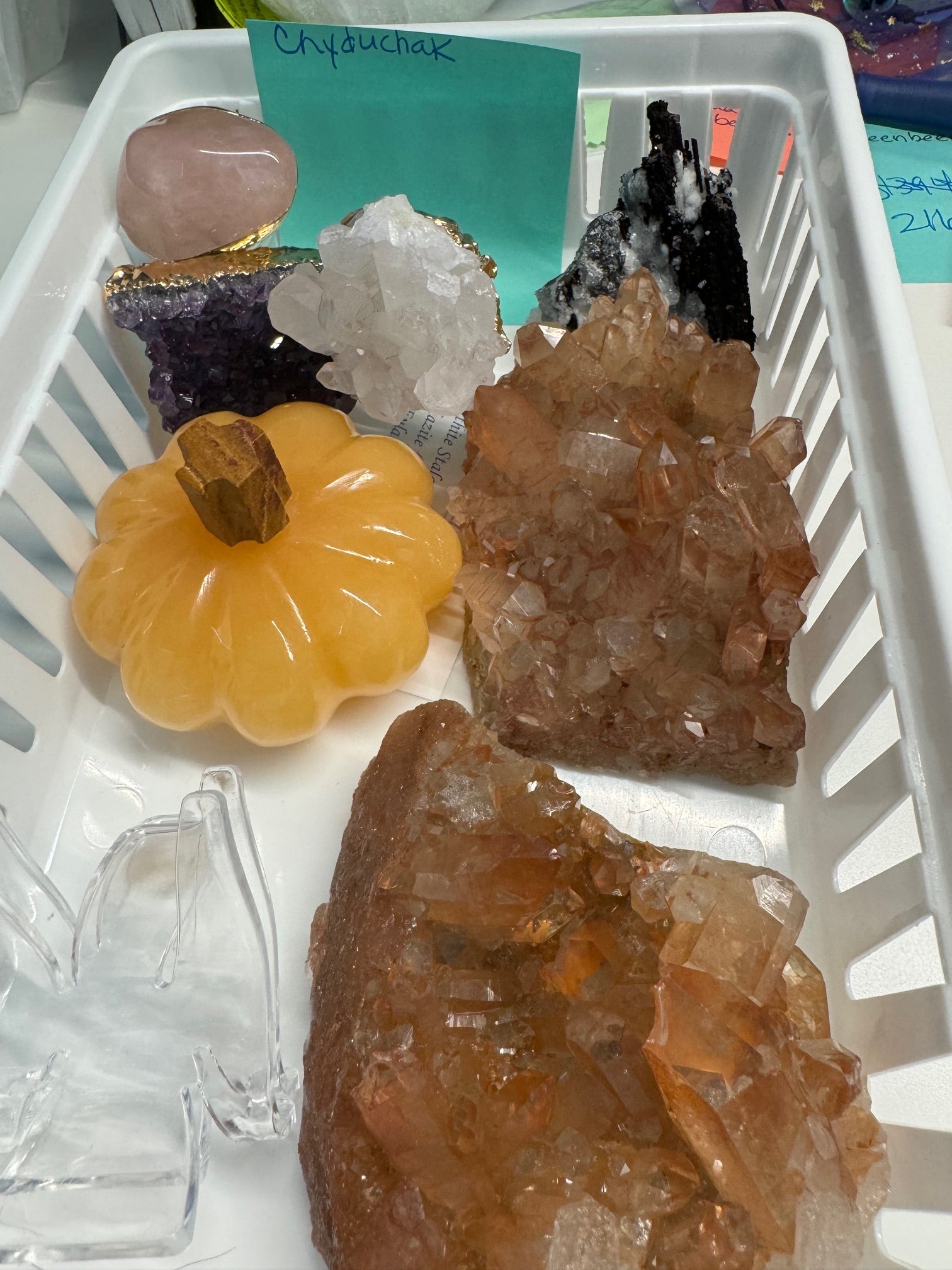 live sale claims 9/21/24: Rose Quartz wine stopper 20.00, clear quartz & amethyst wine stoppers 46.00, calcite pumpkin 20.00, goethite 44.00, tangerine quartz (2) 38.00= 168.00
