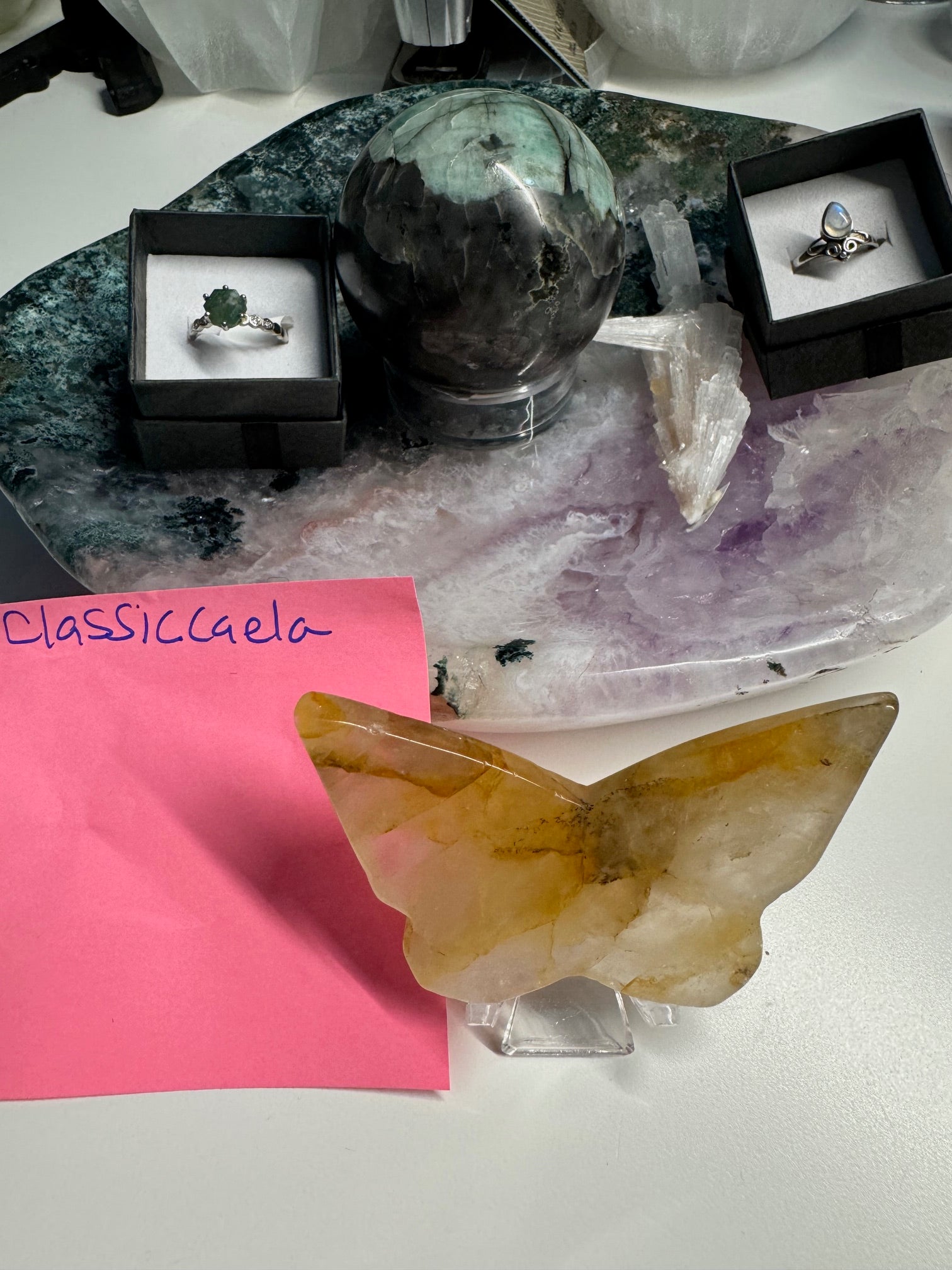 live sale claims 10/12/24: moonstone ring 25.00, moss agate ring 14.00, golden healer butterfly 22.50, emerald sphere 52.00, amethyst & jasper bowl 85.00, scolecite 32.00= 230.50.