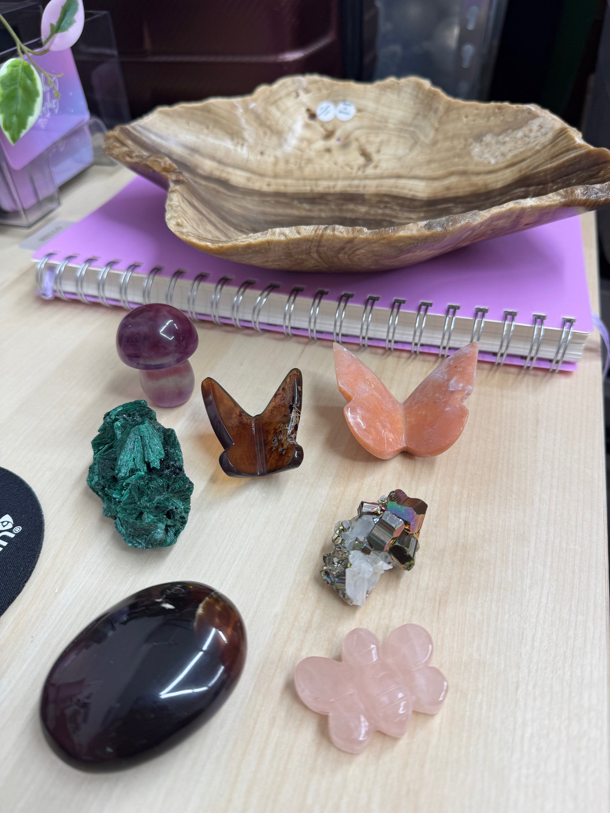 live claims 3/1/25: chocolate onyx bowl 110, blue amber palm 12, blue amber butterfly 18, malachite for MJ 24, fluorite mushy 6, rainbow pyrite with quartz 14, rose quartz bee 15, pink carnelian butterfly 22= 221