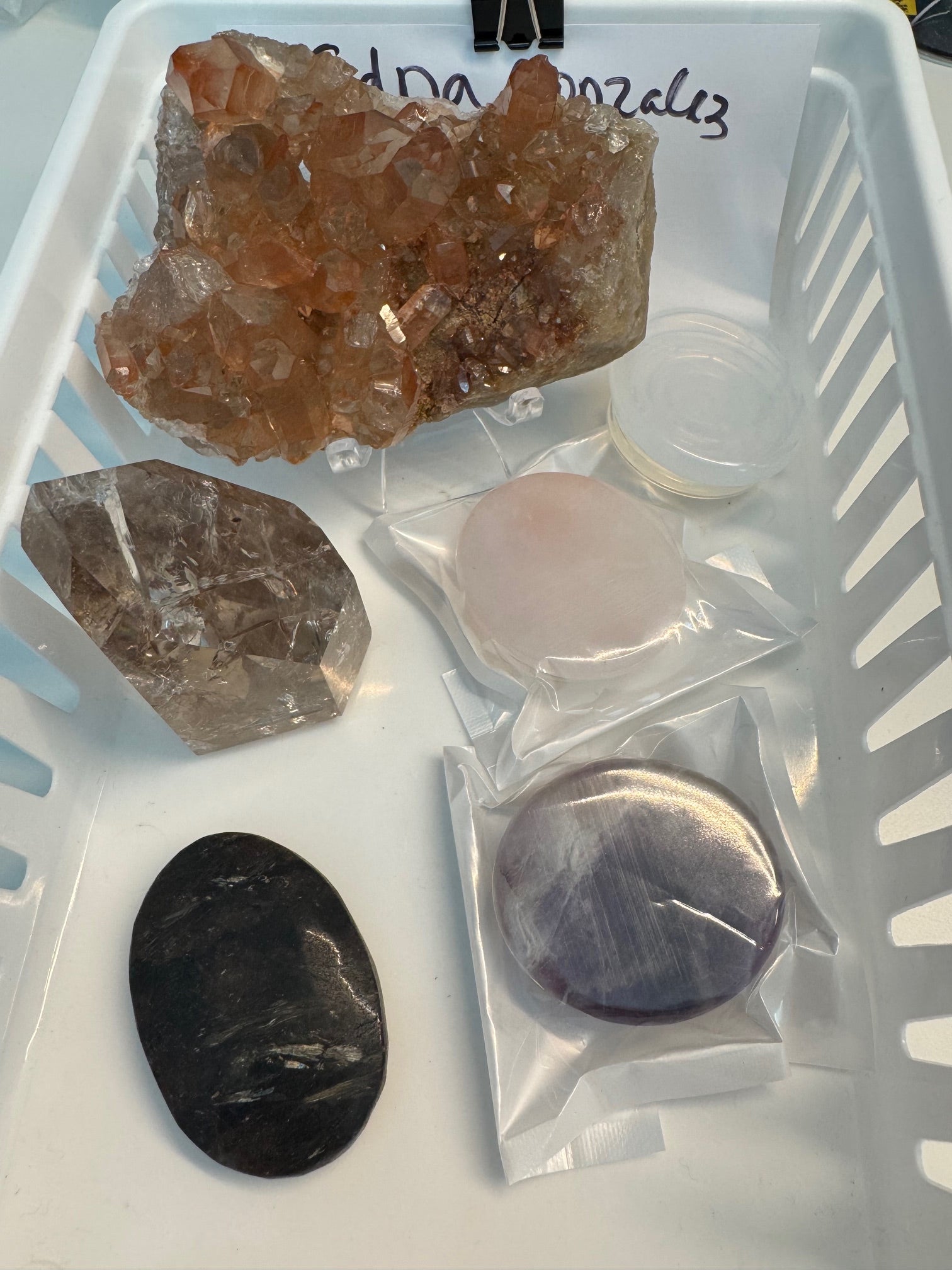 live claims 1/18/25: tangerine quartz 25, smoky crackle tower 19, 3 popsockets rose quartz, amethyst, opalite (3x10) 30= 74
