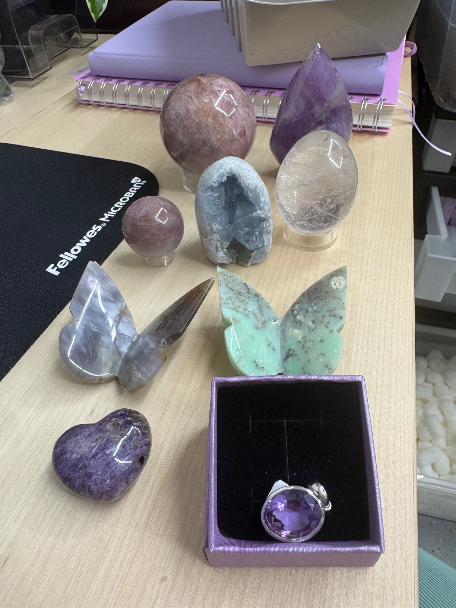 live claims 3/15/25: lavender rose quartz sphere 48, small lavender rose quartz sphere 14, amethyst flame 22, celestite ff 18, clear quartz egg 26, purple chalcedony butterfly 20, chrysoprase butterfly 22, charoite heart 20, amethyst pendant 64= 254