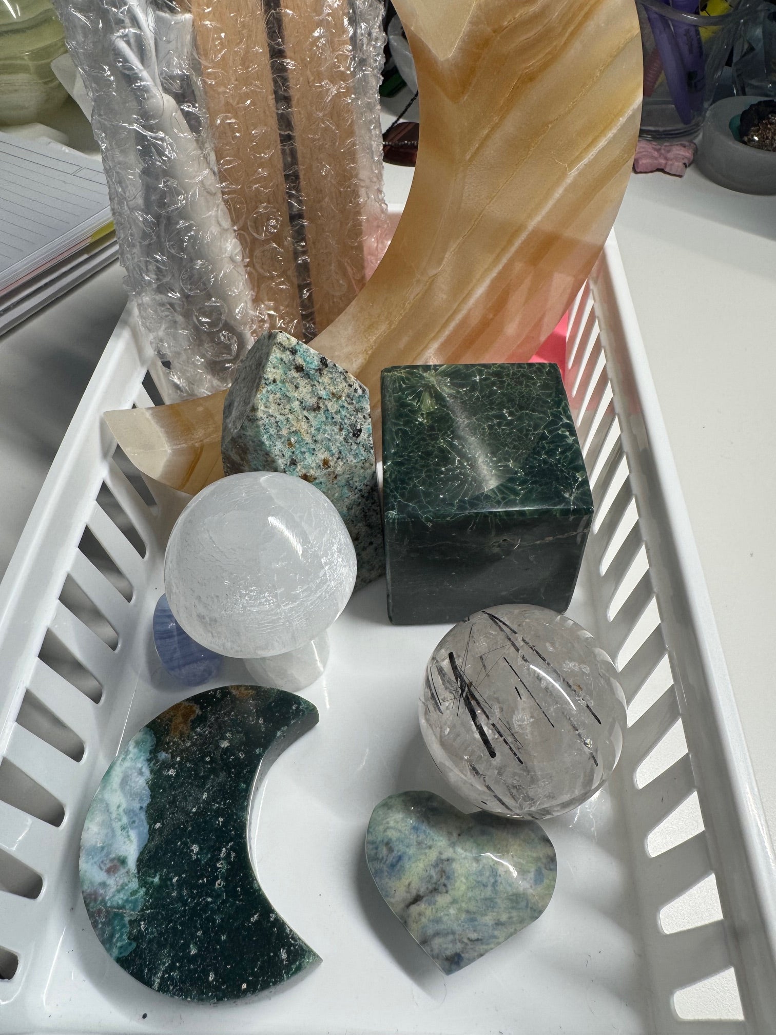 live claims 12/28/24: honey onyx moon with light base 55, tourmalinated quartz sphere 34, hackmanite heart 14 = 103 less 10% discount grand total 92.70 (half 46.35)