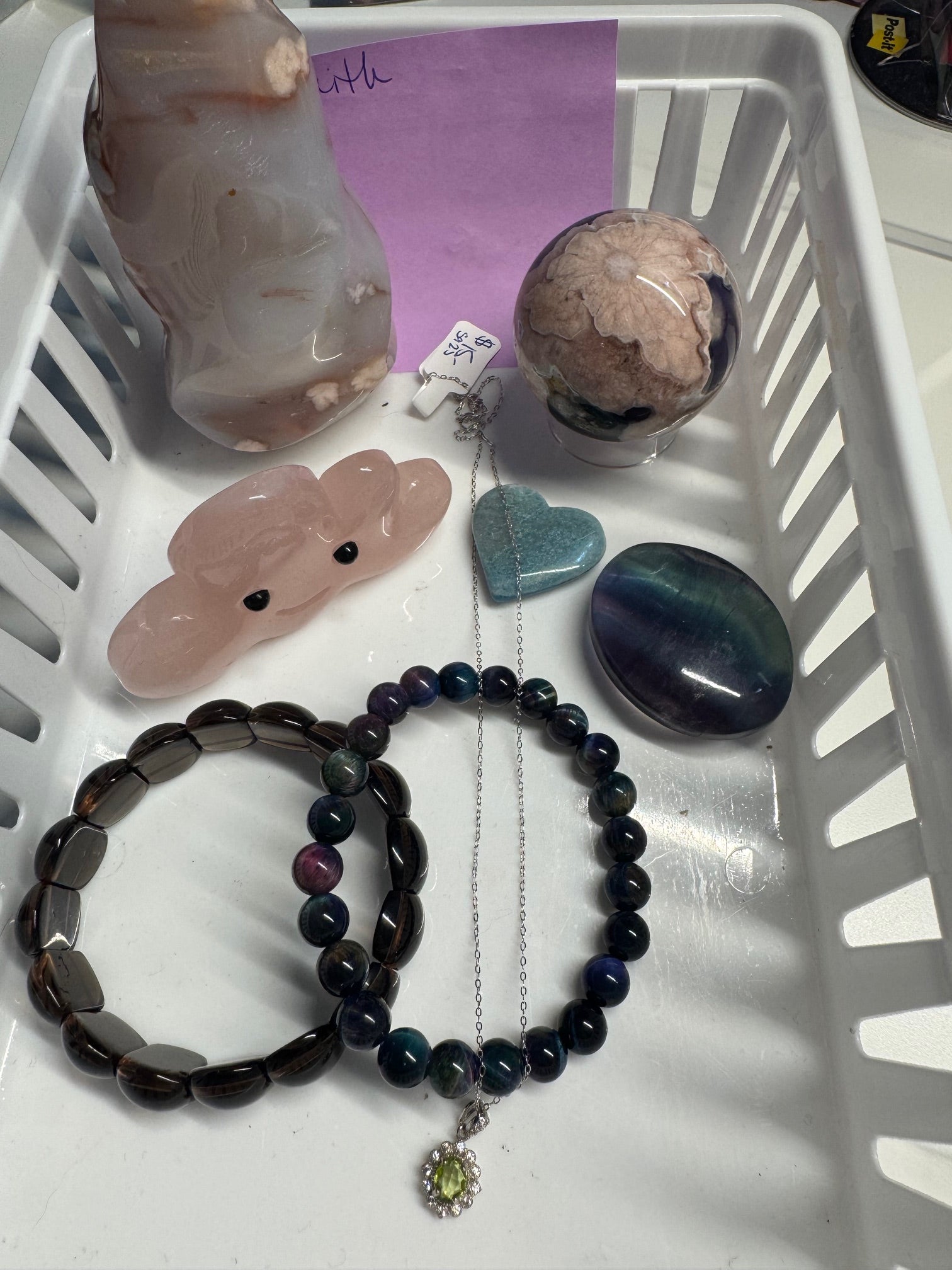 live claims 1/11/24: flower agate flame 28, blue flower agate sphere 34, fluorite palm 5, peridot necklace 15, galaxy tiger's eye bracelet 8, smoky bangle 25= 115