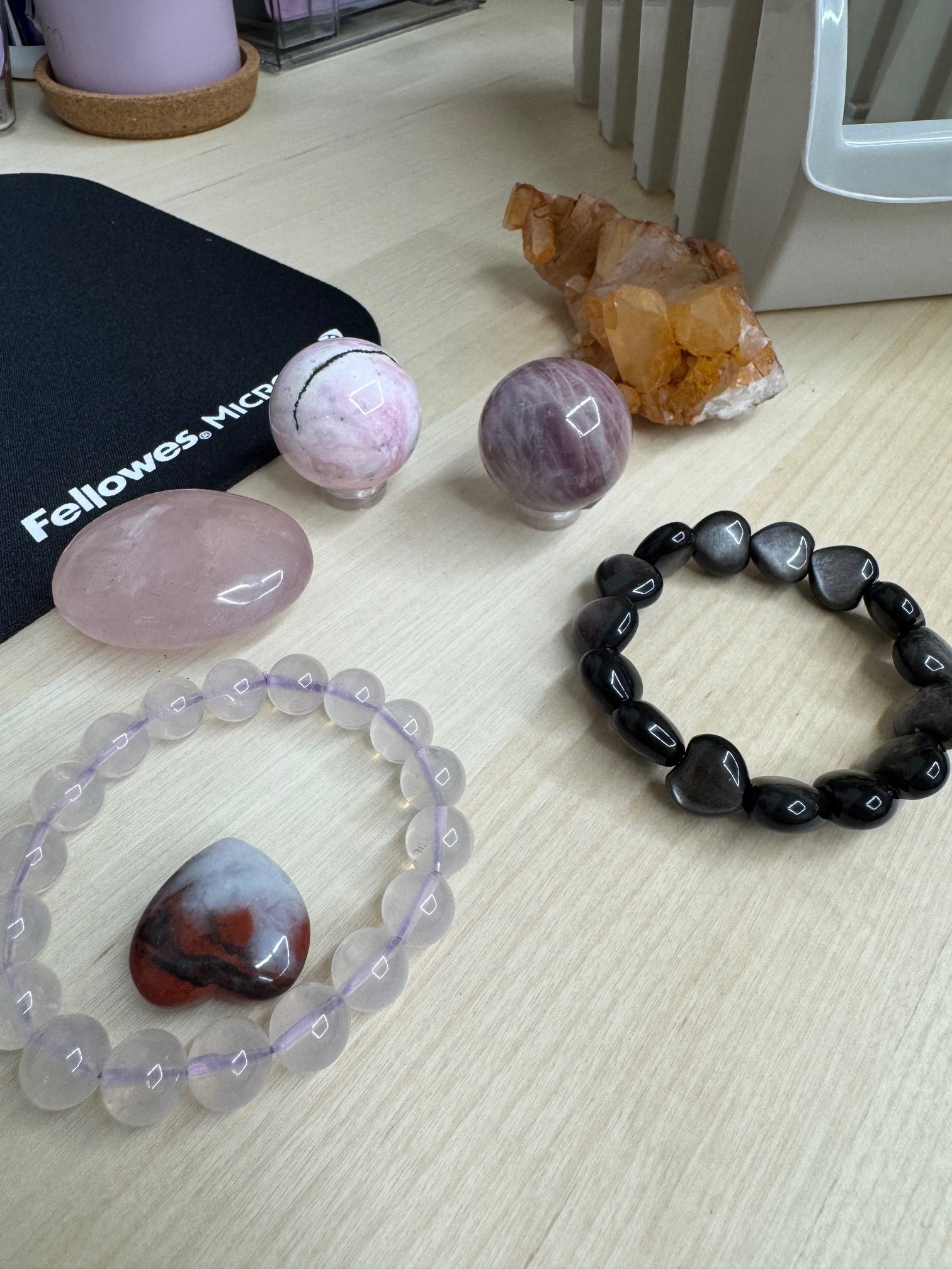 live claims 2/1/25: rose quartz palm 6, rhodonite small sphere 11, lavender rose quartz sphere 14, silver sheen obsidian heart bracelet 28, lavender moon bracelet 14, red jasper heart 0= 73