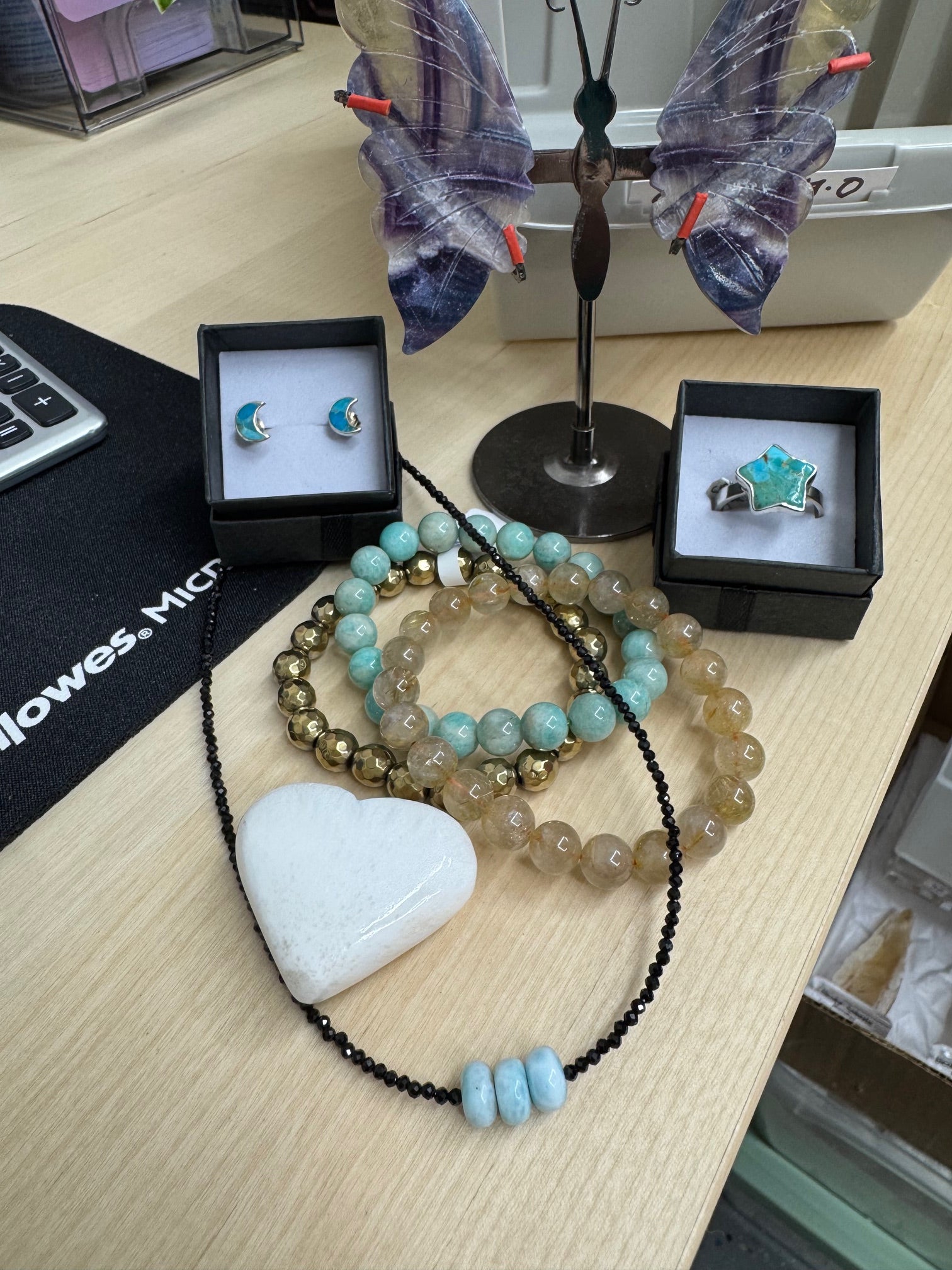 live claims 2/15/25: Turquoise ring 32, turquoise earrings 30, Fluorite butterfly 22, scolecite heart 6, amazonite, golden rutile & hematite bracelets 21=111.00