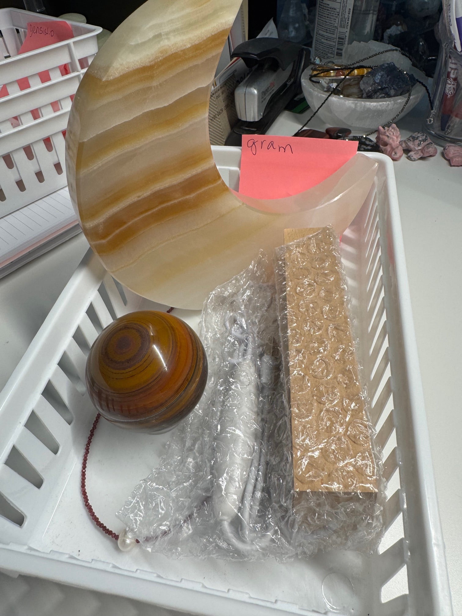 live claims 12/28/24: honey onyx moon w/ light up base 55, tiger's iron 38, garnet & pearl necklace 12=105.00