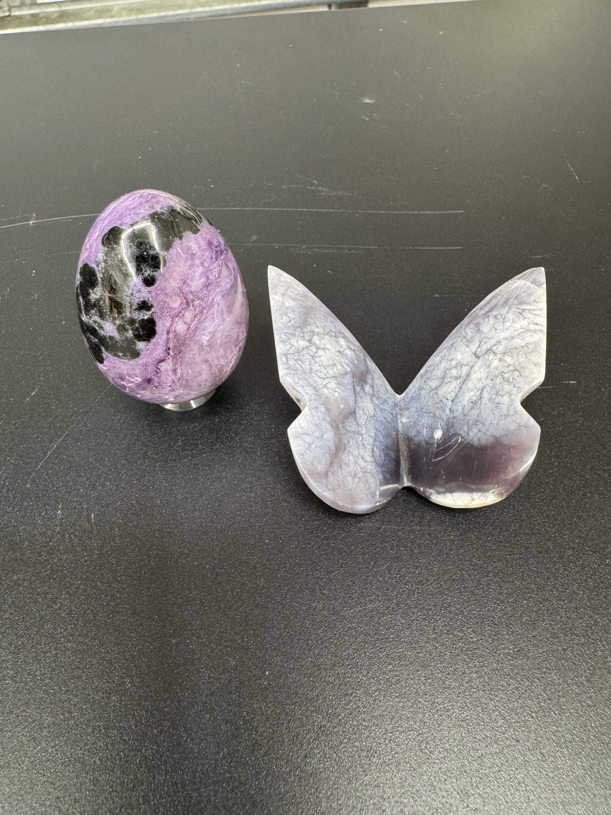 live claims 3/15/25: charoite egg 55, purple purple chalcedony butterfly 22= 77 less 25 deposit = 52