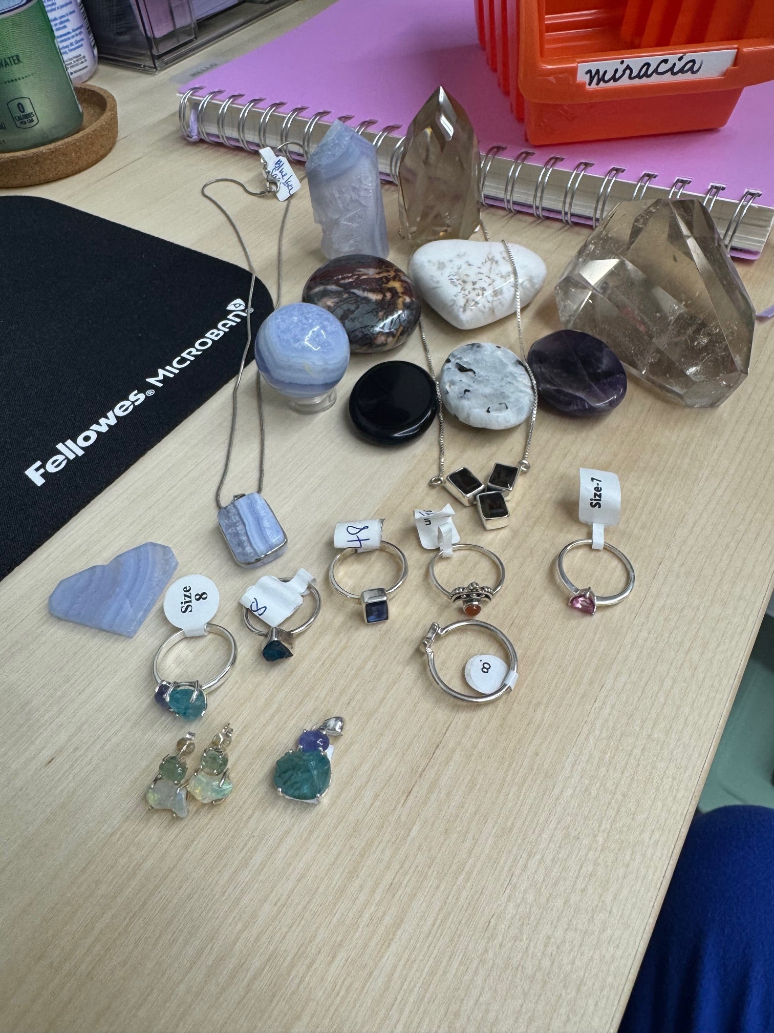 live claims 2/22/25: smoky ff 25, smoky faceted flame 22, blue lace tower 14, blue lace sphere 20, red jasper x hematite palm 15, scolecite heart 10, obsidian, rainbow moonstone, amethyst mini worry stones (3x3) 9, smoky necklace 58, blue lace pendant 22, pink topaz ring 35, carnelian ring 32, moonstone moon ring 25, kyanite ring 48, blue apatite ring 28, blue apatite & tanz ring 48, blue apatite & tanz pendant 48, opal & mint kyanite earrings 48= 507