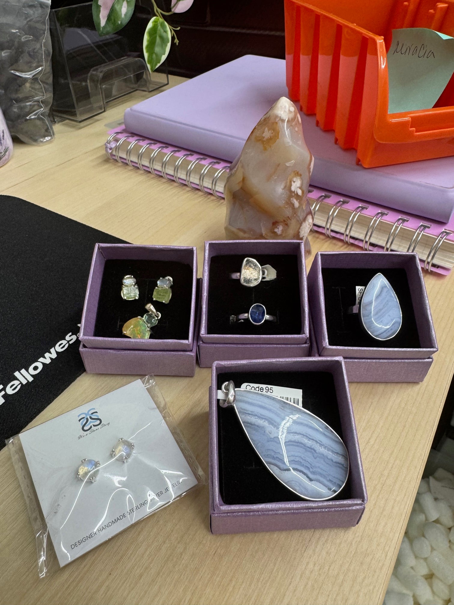 live claims 3/15/25: flower agate flame 18, opal & mint kyanite pendant 48, green kyanite & lab earrings 48, herk ring 46, kyanite ring 48, moonstone earrings 35, blue lace ring 48, blue lace pendant 50= 341