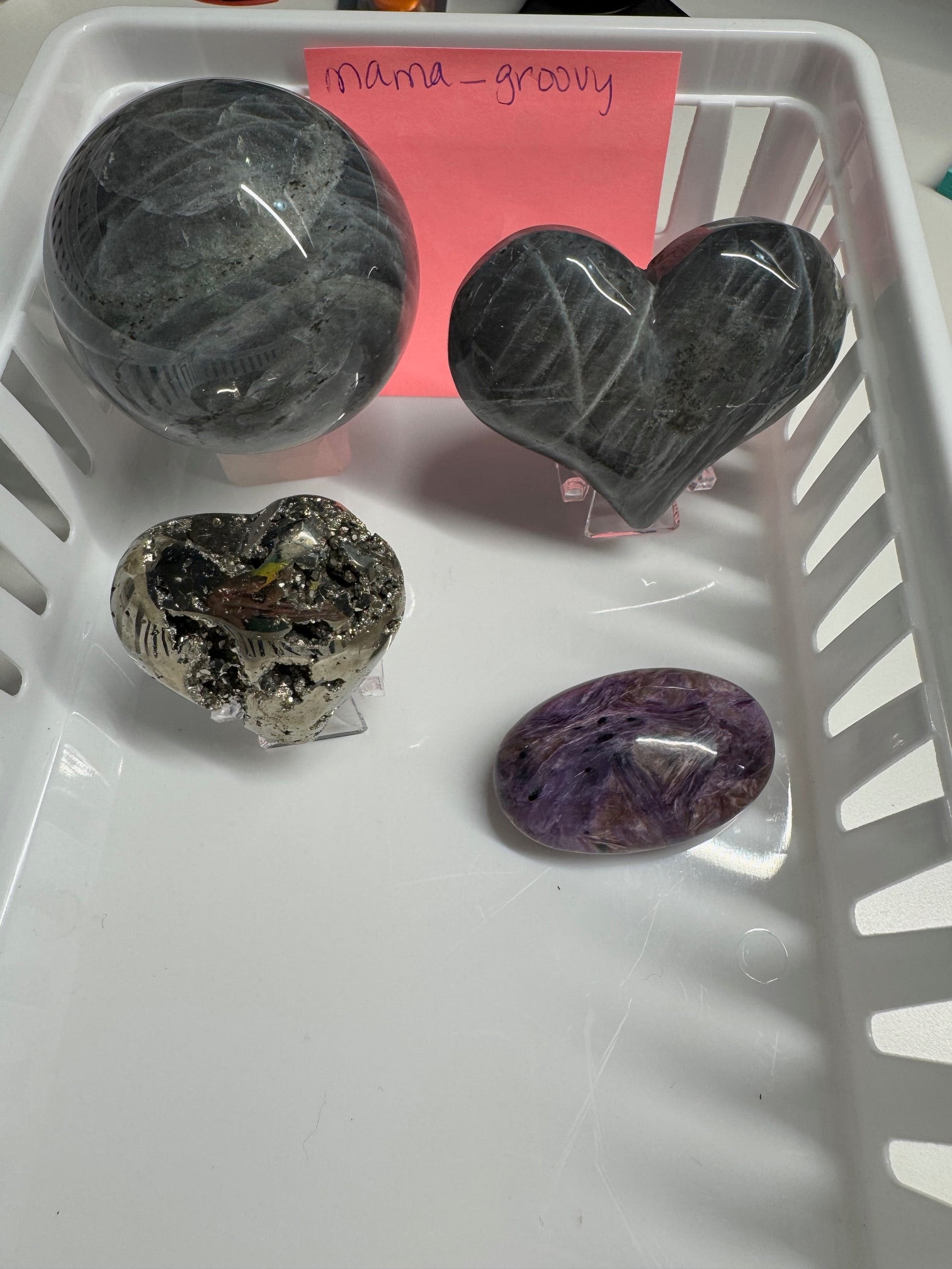 live claims 1/4/25: lab sphere 52, selenite sphere stand 0 gift, lab heart 26, pyrite heart 10, charoite 26= 114