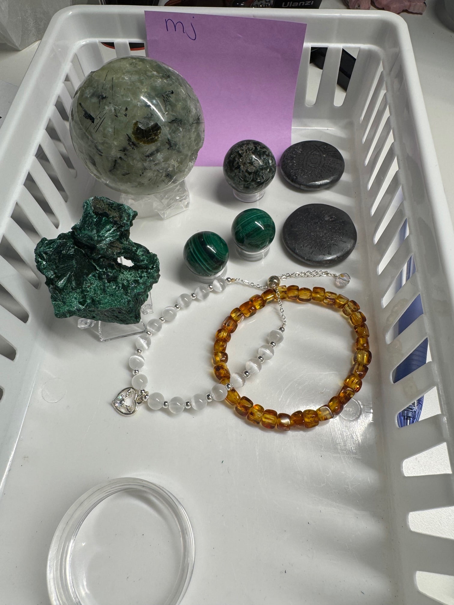 live claims 1/4/25: prehnite sphere 30, malachite (gift) 0, 2 malachite mini spheres (2x8) 16, 2 hematite evil eye coins (2x8) 16, selenite bracelet 6, seraphinite sphere 23=91