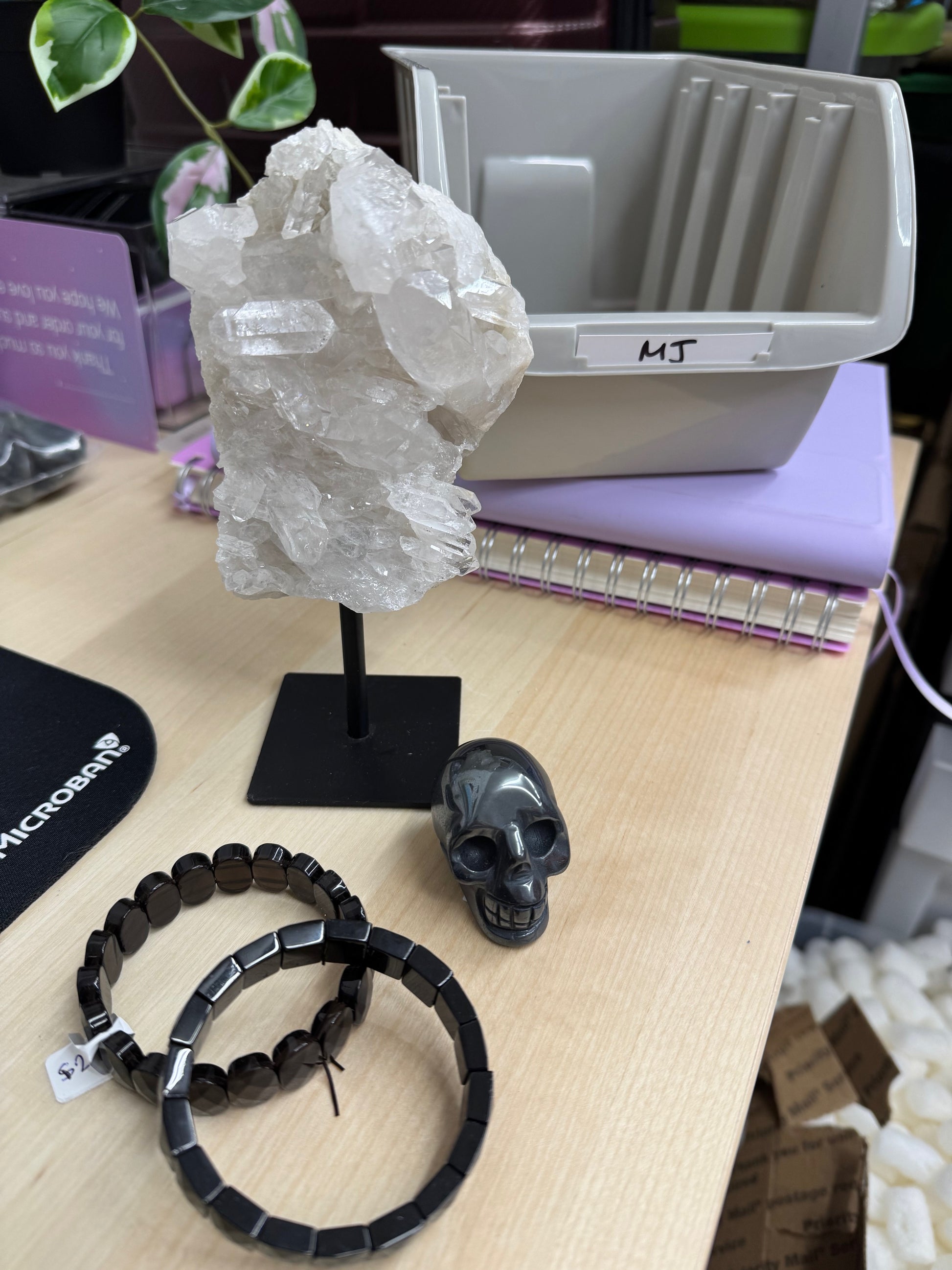 live claims 3/8/25: clear quartz cluster 28, terahertz skull 10, smoky bangle 22, obsidian bangle 22= 82