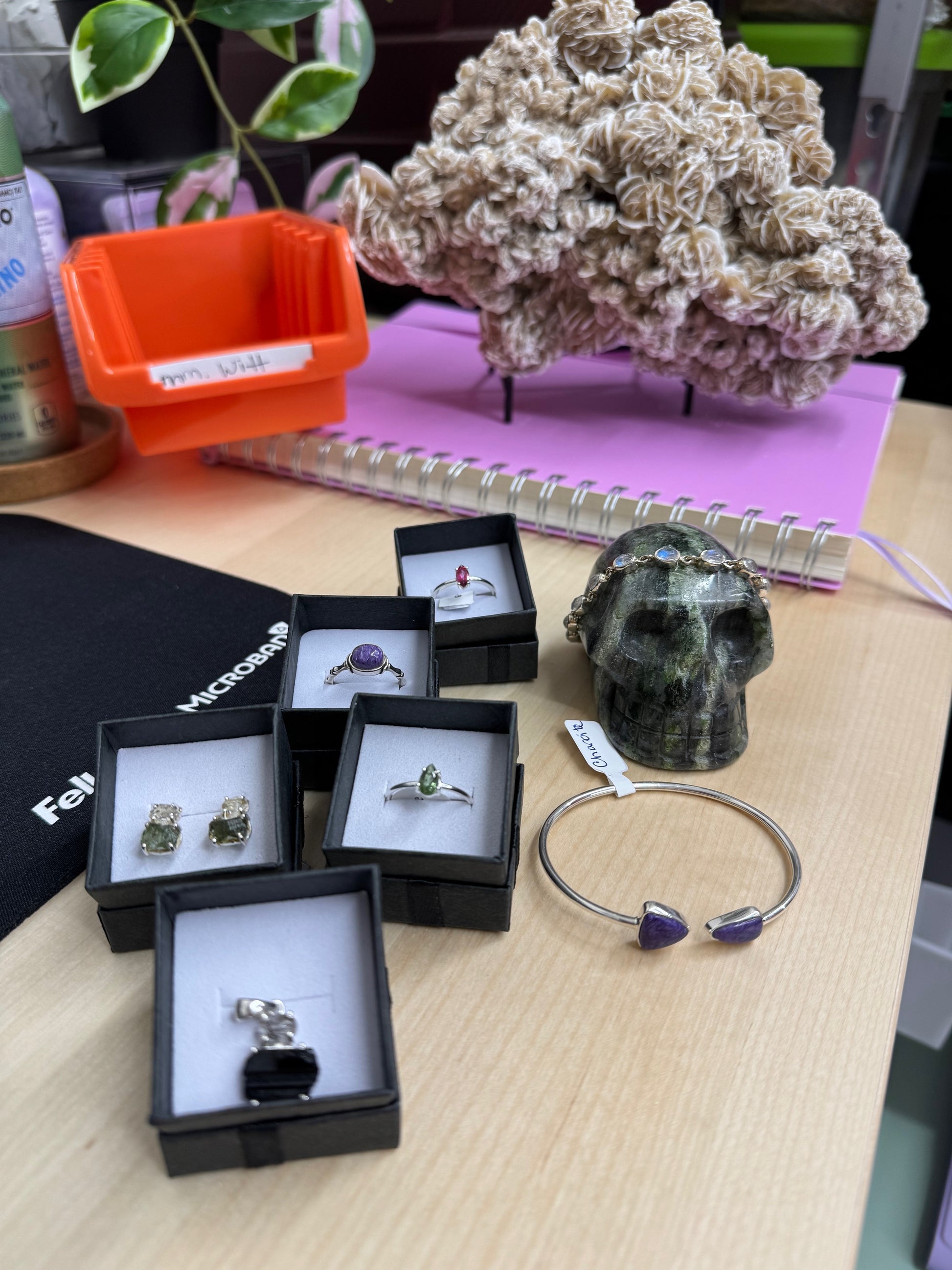 live claims 2/22/25: Desert rose 55, epidote & quartz skull 99, charoite bangle 110, moonstone bracelet 90, tourmaline & rutilated pendant 48, faceted moldavite 48, moldavite & pakimer earrings 48, charoite ring 16, pink topaz ring 35 = 549 less deposit -25 = total 524.00
