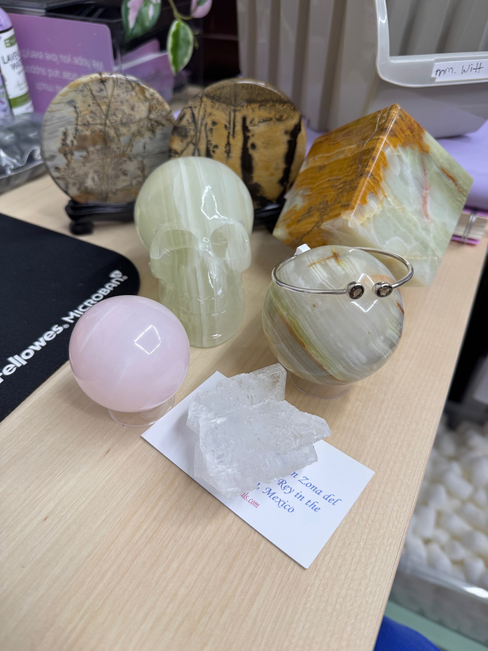 live claims 3/8/25: onyx skull 37, mangano pink calcite sphere 12, 2 scenic jasper disks (2x20) 40, fish tail selenite 14, smoky quartz bangle 70= 173