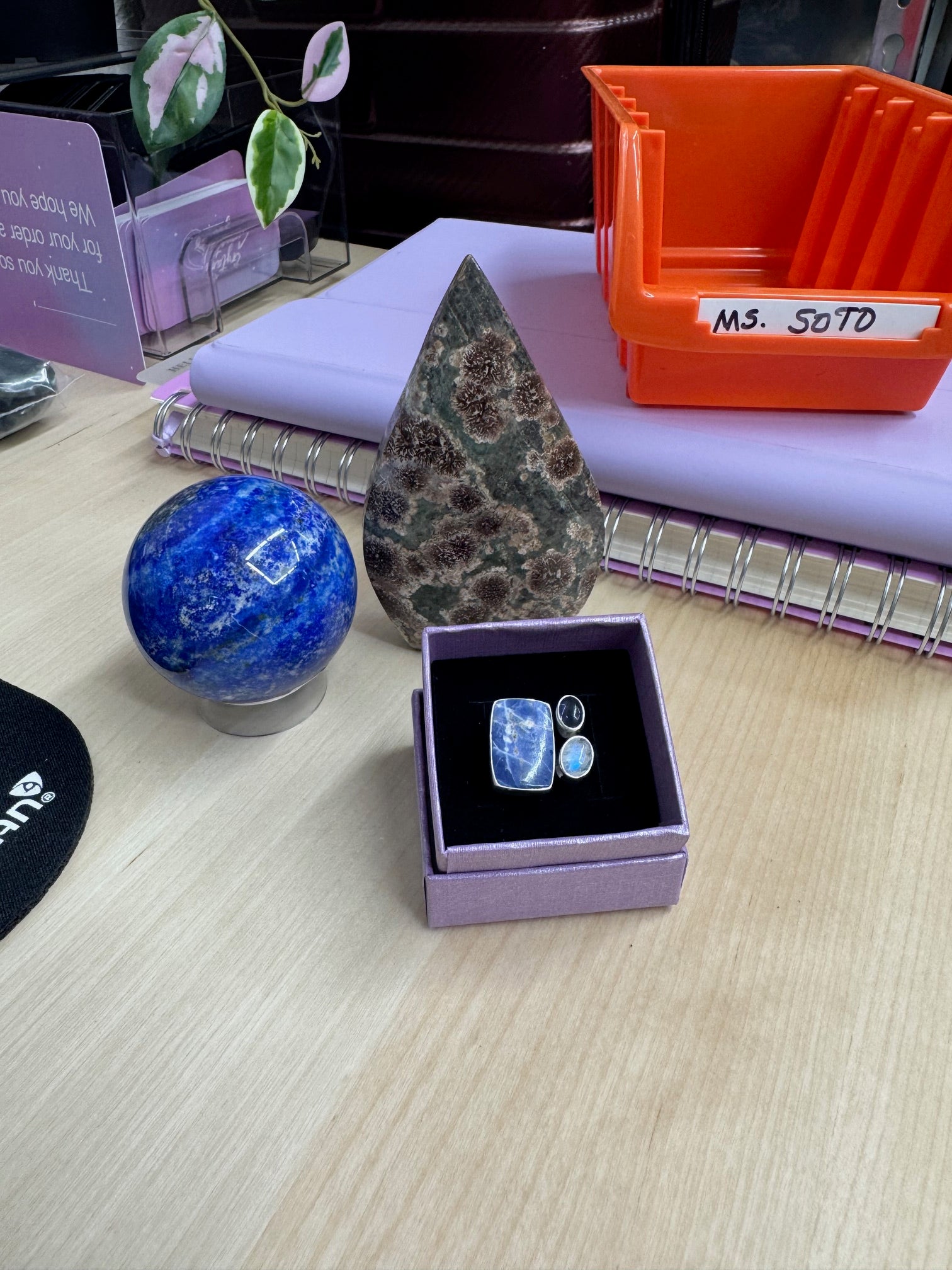 live claims 3/8/25: lapis sphere 24, green sakura jasper free form 20, sodalite ring 52= 96