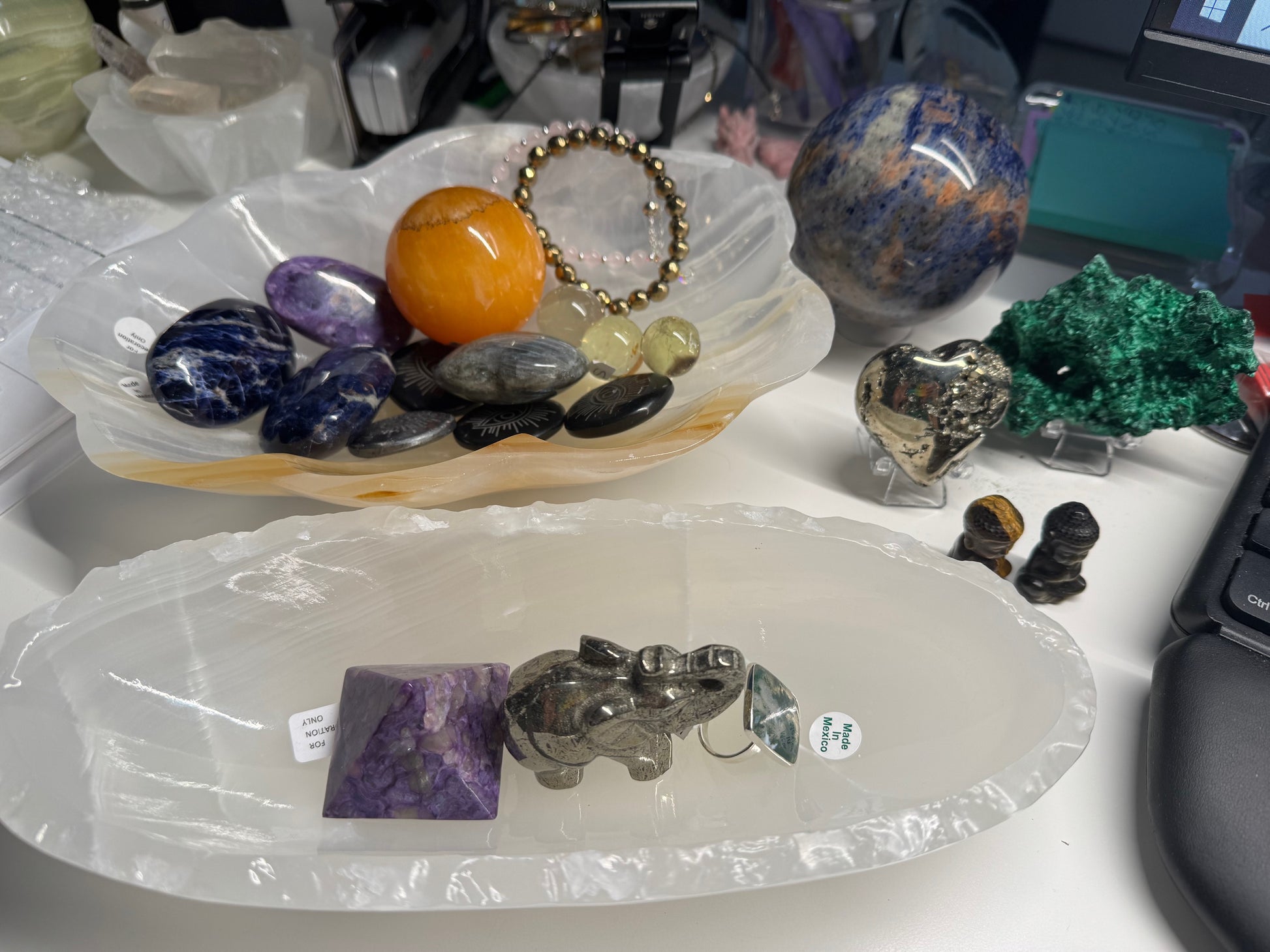 live claims 1/4/25: onyx bowl 85, onyx canoe bowl 75, obsidian evil eye (3x8) 24, hematite evil eye 8, 2 sodalite palms (2x10) 20, lab heart 18, charoite palm 26, charoite pyramid 29, pyrite heart 11, pyrite elephant 20, citrine mini spheres 4, 5, 7, tiger's eye small buddha 8, gold sheen buddha 8, sunset sodalite sphere 55, malachite 45, moss agate ring 40, hematite bracelet 10, rose quartz bracelet 6= 504 less 10% friend referral 453.60