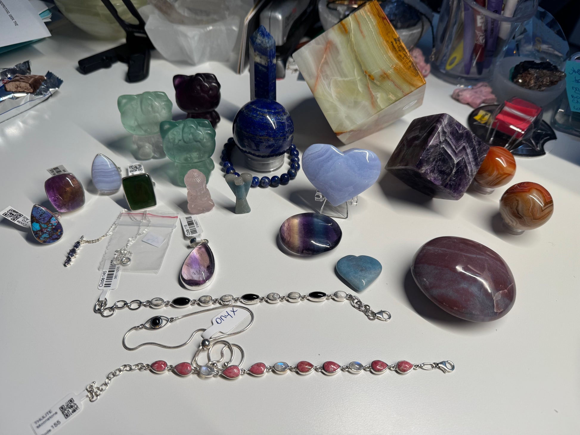 live claims 1/11/25: green onyx floating cube 22, chevron amethyst floating cube 18, sardonyx sphere 15, sardonyx sphere 10, 3 Hello Kitty's (3x15) 45, Blue lace agate heart 20, oj palm 9, fluorite palm 5, trolite heart 6, blue lace agate ring 50, jade ring 55, ametrine ring 65, purple blue copper turquoise ring 55, ametrine pendant 55, iolite necklace 45, onyx evil eye bracelet 42, onyx & howlite bracelet 68, thulite & moonstone bracelet 75= 660.00 less 10% friends discount 594