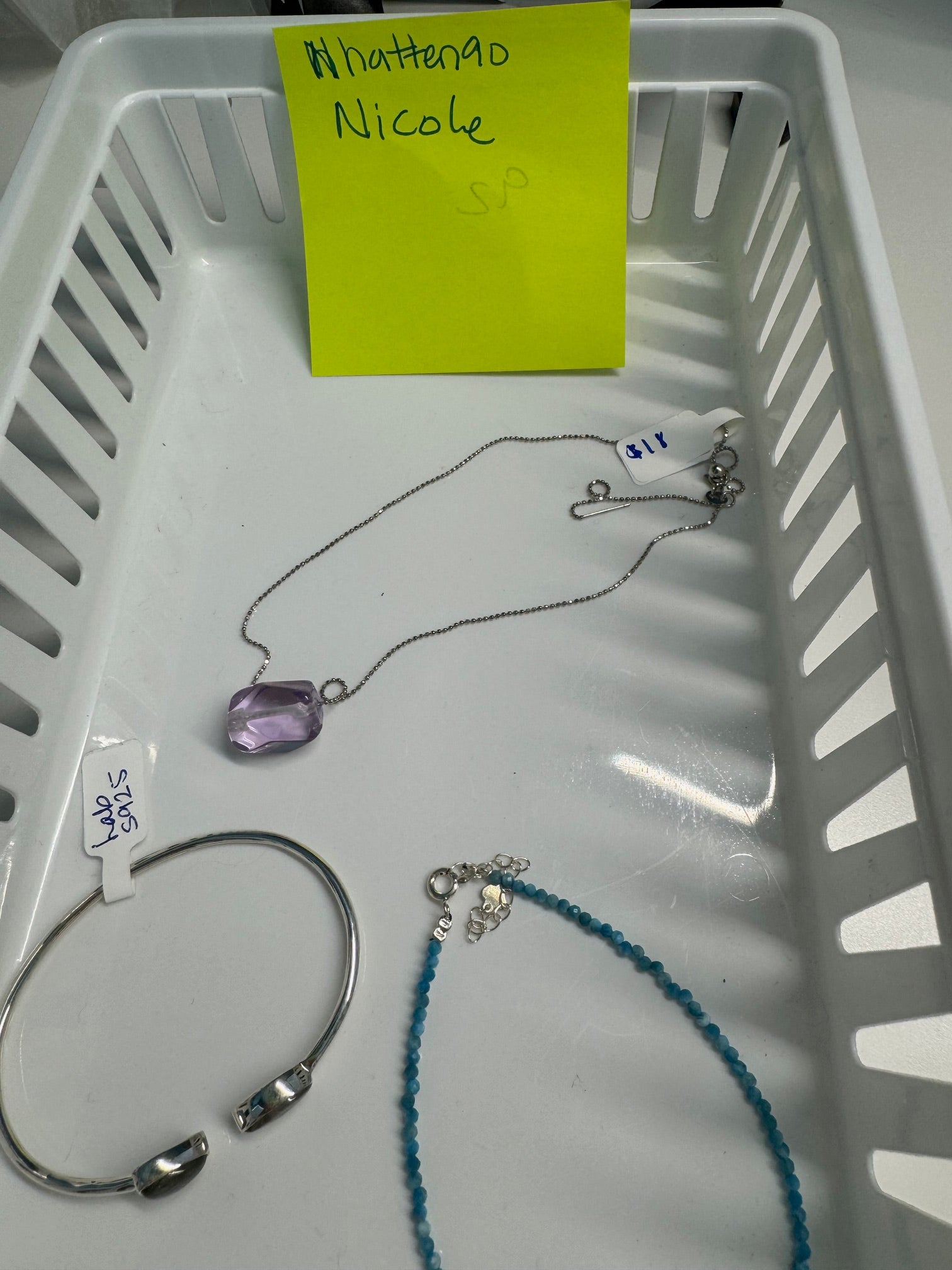 live sale claims 9/28/24: amethyst bead necklace 18.00, lab bangle 62.00, blue apatite anklet 12.00= 92.00 less deposit 25.00= 67.00