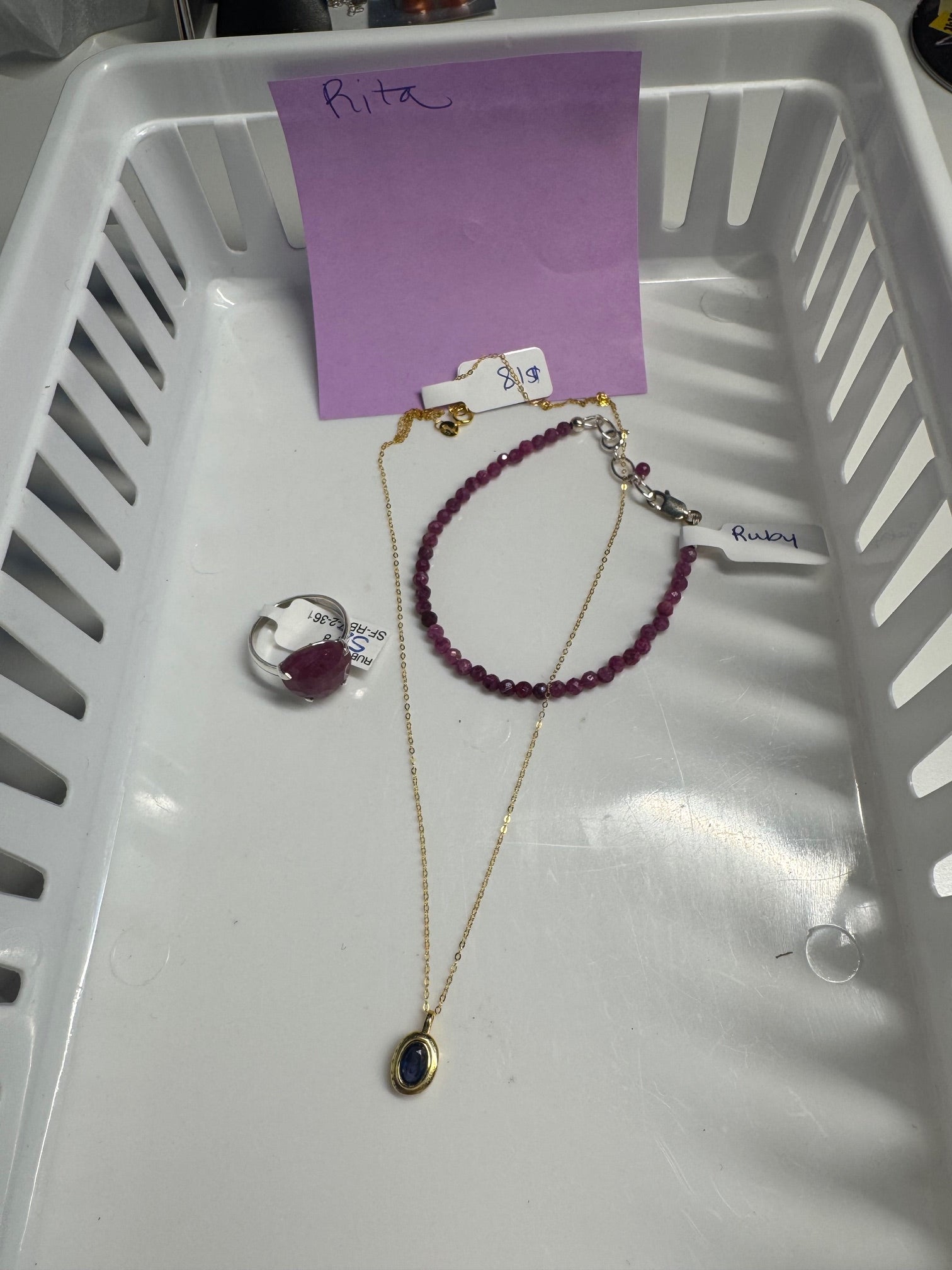 live claims 1/11/25: Ruby ring 52, ruby bracelet 40, sapphire pendant 18= 110