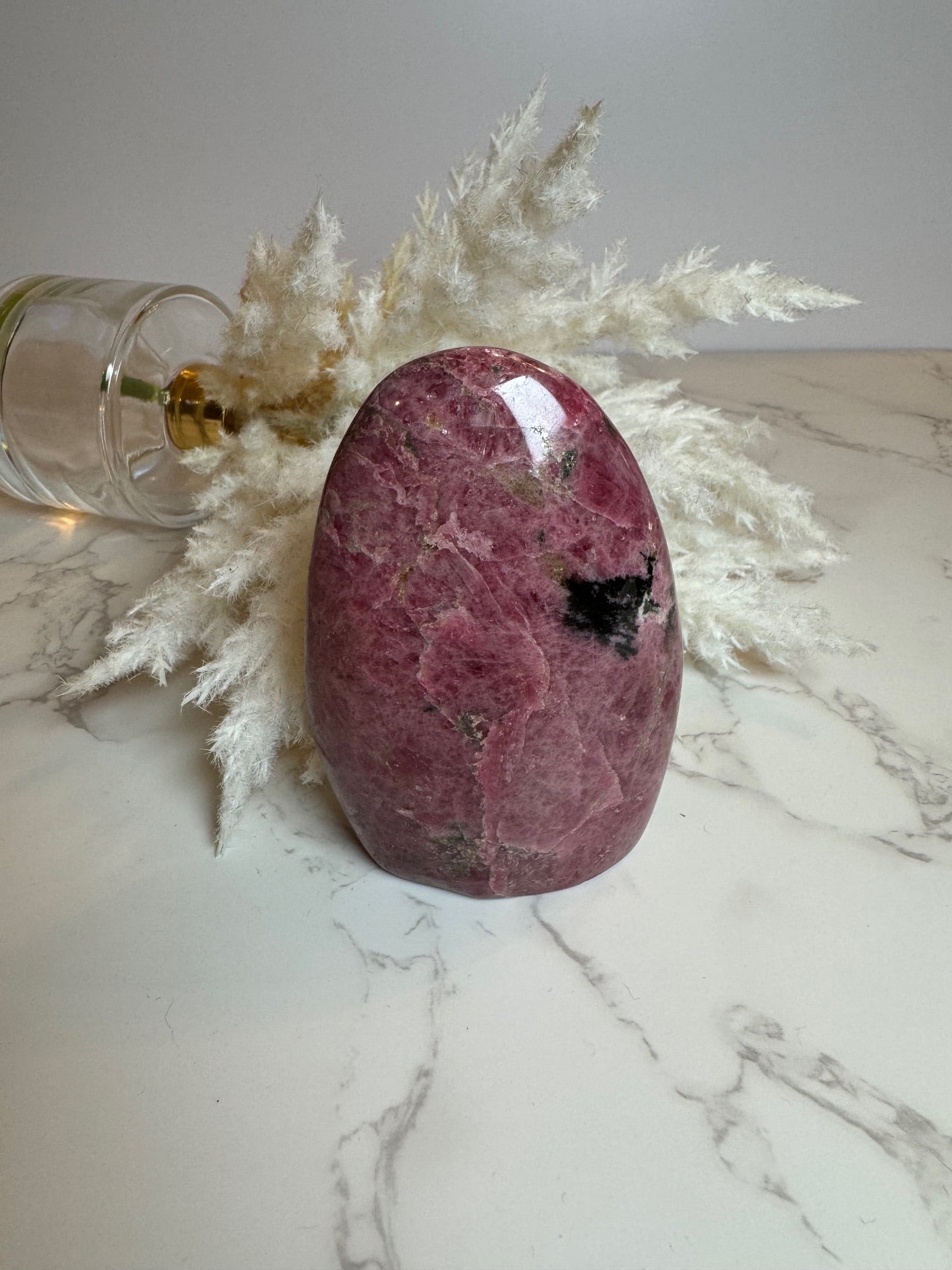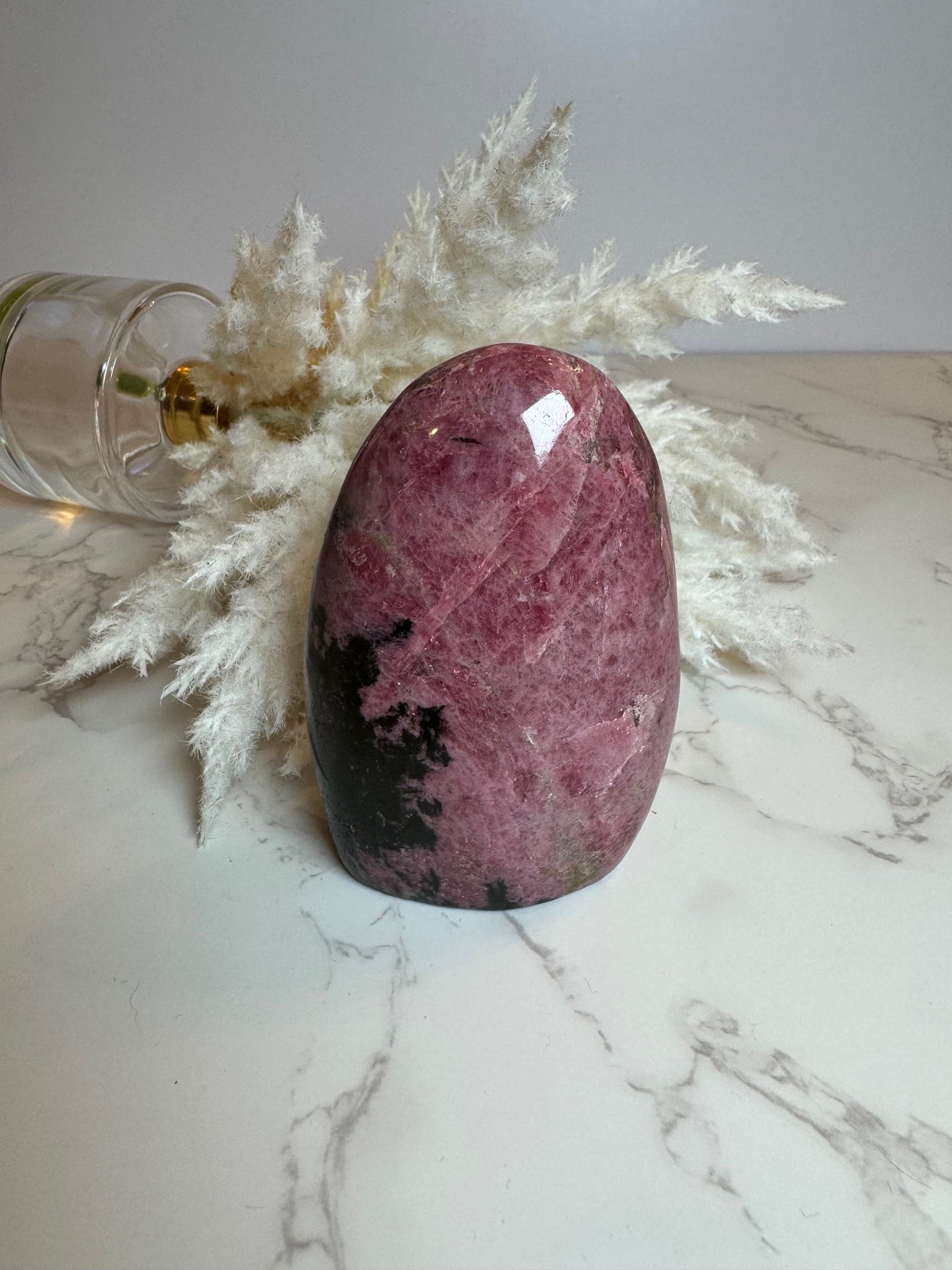 Gorgeous gemmy rhodonite free form. Approximately 4 inches tall and 2.5 inches wide.