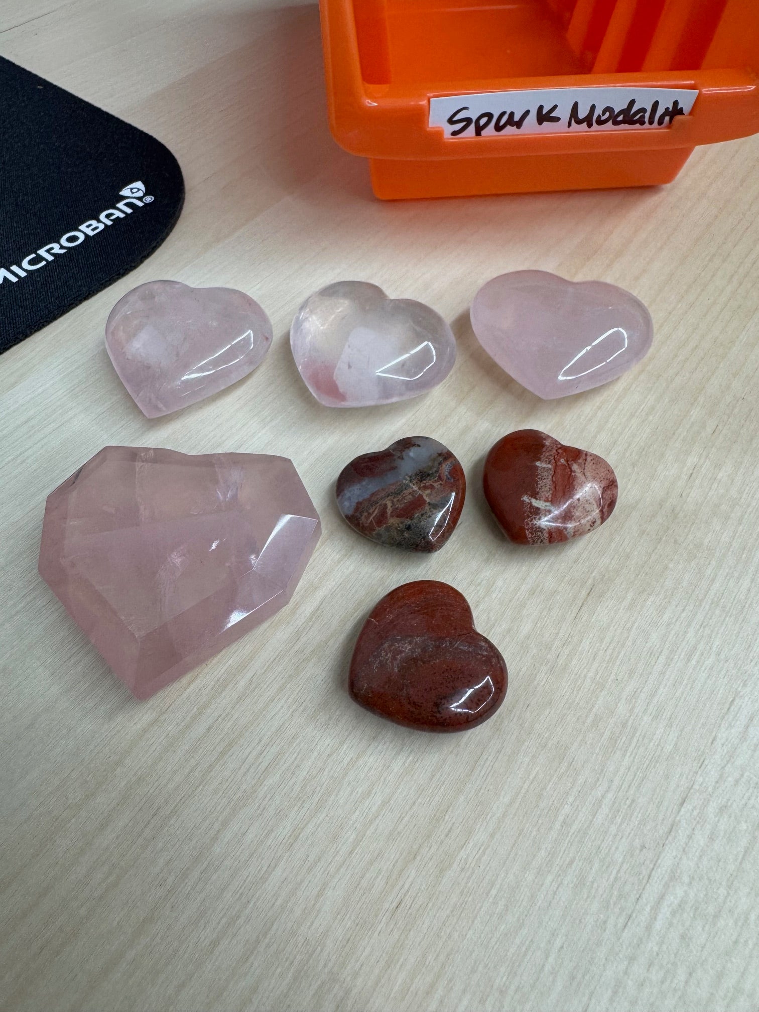 live claims 2/1/25: faceted rose quartz heart 10, 3 small rose quartz hearts (3x6) 18, 2 red jasper hearts (2x4) 8, 1 free red jasper heart = 36