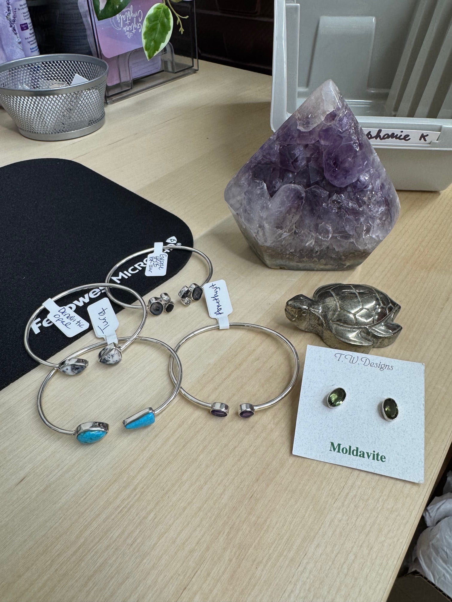 live claims 2/8/25: turq bangle 105, dendritic bangle 68, amethyst bangle 65, geode bangle 118, faceted moldavite earrings 140= 496