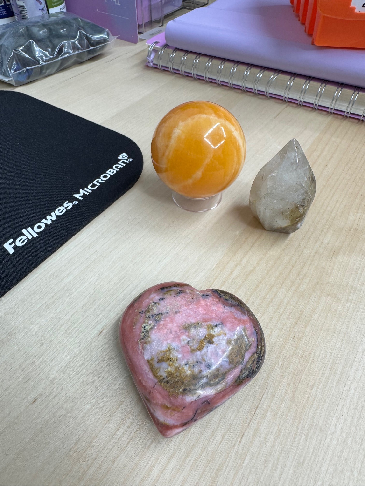 live claims 3/8/25: Strawberry opal heart 17, mosaic quartz free form 6, orange calcite sphere 14= 37