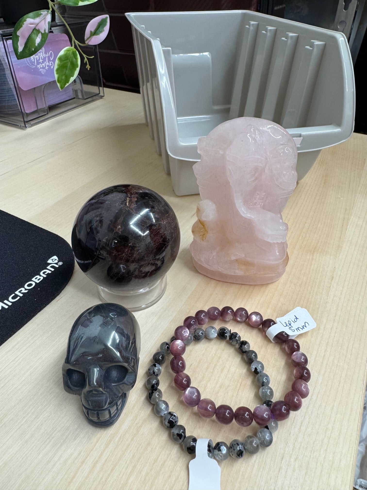 live claims 2/15/25: garnet sphere 79, rose quartz ganesha 47, terahertz skull 15, gem lepidote bracelet 38, starry night moonstone bracelet 18= 197