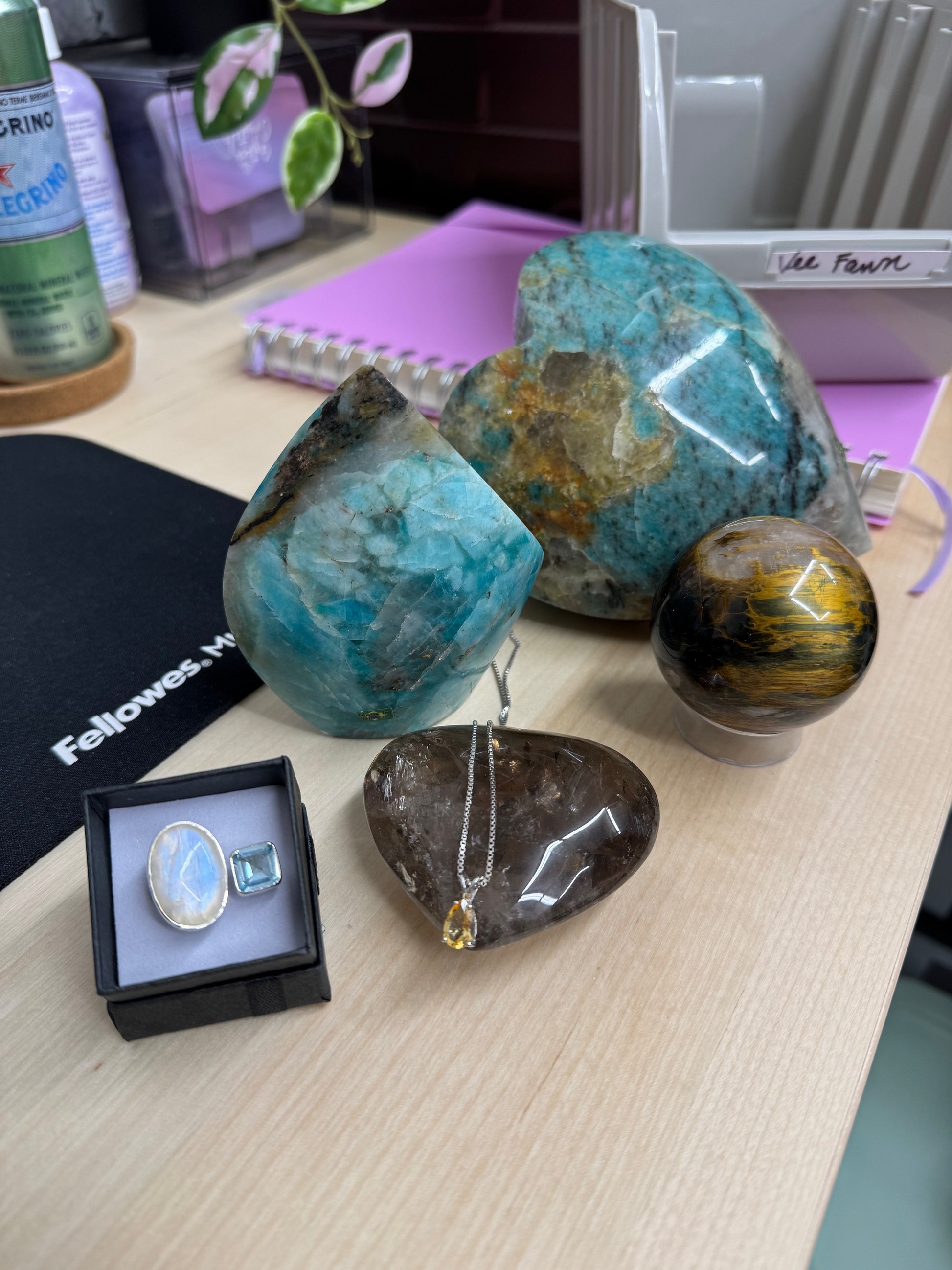 live claims 2/22/25: amazonite heart 150, amazonite flame 55, nellite sphere 38, moonstone & topaz ring 70= 313.00