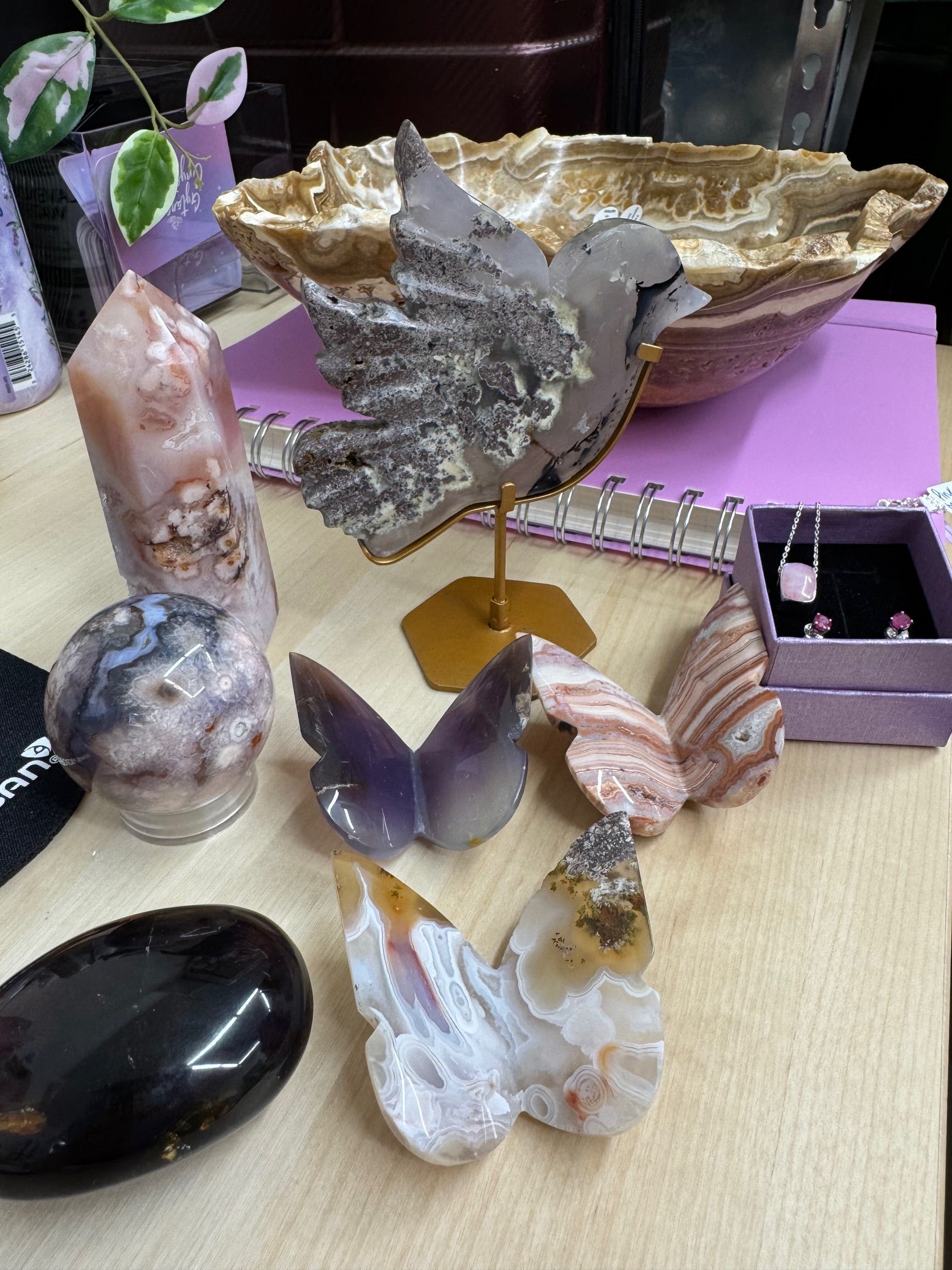 live claims 3/1/25: chocolate onyx bowl 140, scenic moss bird 65, purple chalcedony, pink crazy lace butterflies (2x 22) 44, scenic moss butterfly 38, blue amber palm 12, blue flower agate sphere 38, flower agate tower 40, ruby earrings 40, pink moonstone necklace 50= 467